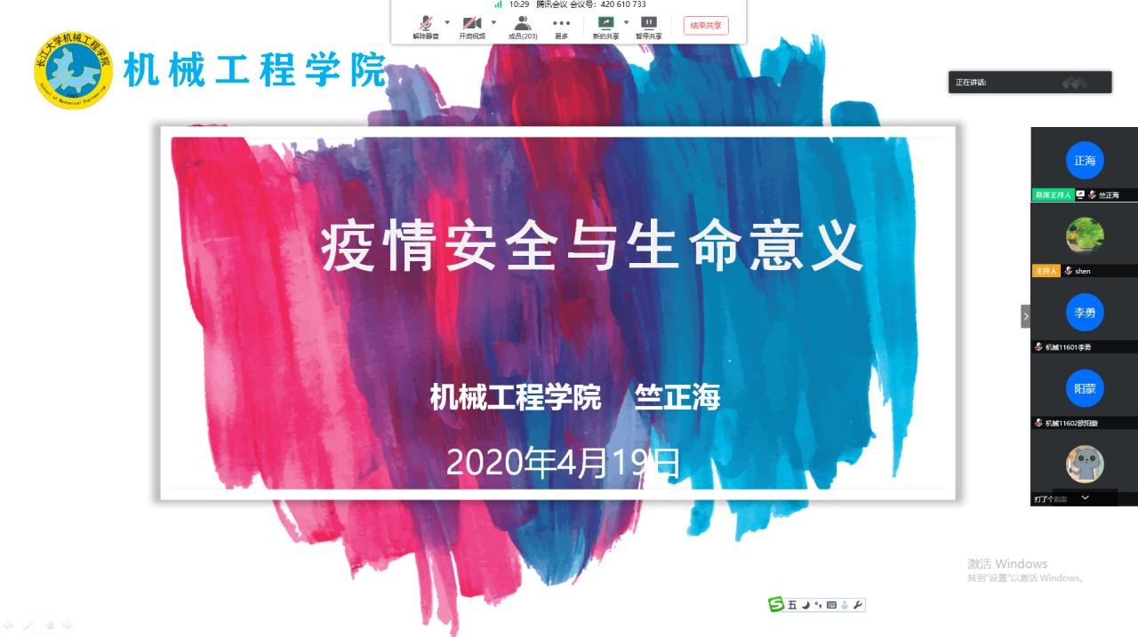 4月19日晚上,太阳成集团122ccvip开展线上疫情期间心理与安全教育活动,公司党委副书记竺正海以《疫情安全与生命意义》为题进行专题讲座,全体辅导员及300多名员工干部参加。
