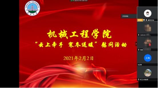 献一份爱心,温暖冰冷寒冬,送一句问候,心中阳光和煦。2021年2月2日下午14点,太阳成集团122ccvip开展了“云上牵手 寒假送暖”慰问活动,参加此次活动的有:公司党委副书记竺正海老师、资助专干杨琴老师以及2020级的两位同学,辅导员向如主持活动。