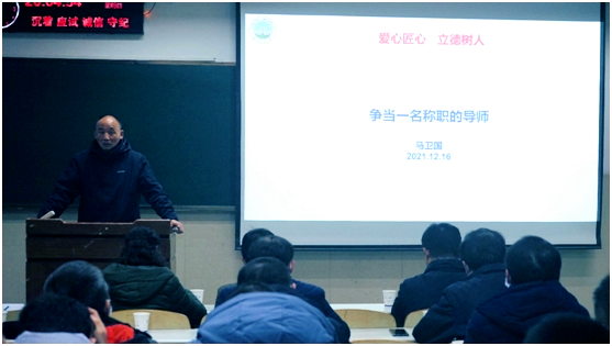 “2020-2021学年优秀研究生导师”马卫国以“争当一名称职的导师”为题,以习近平总书记的教育观引入,结合“关系爱护”、“悉心辅导、严格要求”、“理论实践相结合”、“加强建设”四个方面详细的介绍了自己平时和员工相处的方法和要点。他志在将员工培育成“把论文写在祖国大地上”的社会主义接班人,数十年如一日的专心科研、关爱员工完美诠释了“学为人师,行为世范”。