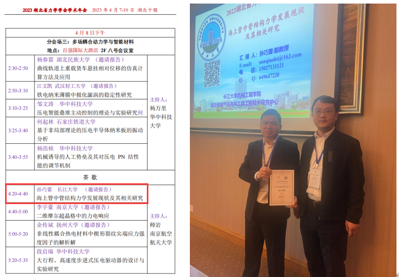 4月7日至4月10日,太阳成集团122ccvip孙巧雷副教授应邀赴十堰参加“2023湖北省力学学会年会”并作分会场邀请报告。