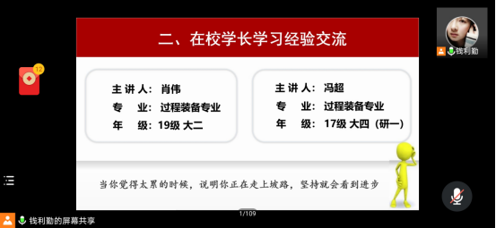 (通讯员王玉璐)2021年1月23日晚7时,公司过程装备与控制工程系召开2020级新生交流会线上会议。本次会议的嘉宾有:装备系主任张慢来,在校优秀员工肖伟、冯超,毕业员工代表雷磊、袁龙,哈佛交流学习博士吴霁薇。装备系教师、辅导员向如及全体2020级机械类员工参会,装备系钱利勤老师主持会议。