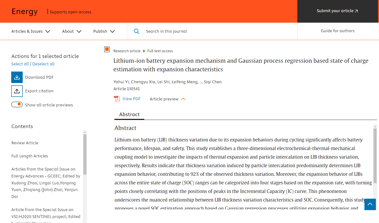 2024年1月31日,中科院一区top期刊《Energy》(《能源》,IF: 9.0)在线刊发了关于锂离子电池膨胀机理的最新研究成果。论文题目为:“Lithium-ion battery expansion mechanism and Gaussian process regression based state of charge estimation with expansion characteristics(锂离子电池膨胀机理和基于高斯过程回归的电荷估计状态)”。公司硕士研究生生伊亚辉、夏成宇教授为论文共同第一作者,钱利勤副教授为论文的通讯作者,太阳成集团122ccvip为论文第一完成单位。