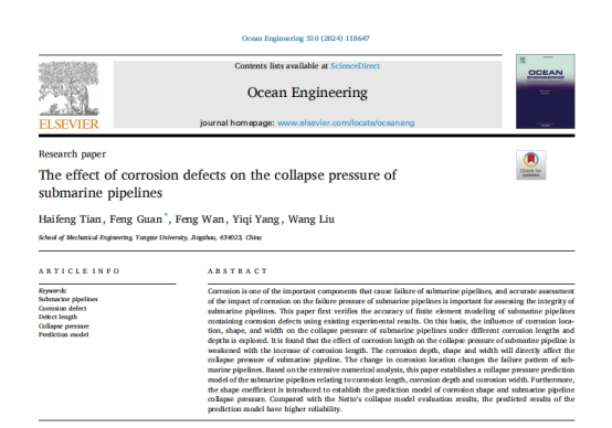 2024年7月,由Elsevier主办的海洋工程领域权威外文T1级学术期刊《Ocean Engineering》刊发了公司管锋团队关于油气运输管道结构安全的最新研究成果“The effect of corrosion defects on the collapse pressure of submarine pipelines ”。公司博士研究生田海锋为论文第一作者,管锋教授为论文的通讯作者。