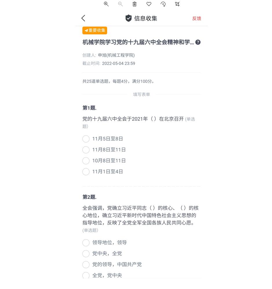 5月4日,全体员工党员通过“辅导猫”线上答题的方式,开展学习党的十九届六中全会精神和学习党史、新中国史、改革开放史、社会主义发展史知识竞赛活动。机械11907班汪智魁同学说:“作为新时代老员工,应该更加深入了解党的历程、感悟党的使命、传承党的基因,发扬敢闯敢拼、努力进取、百炼成钢的优秀品质,争做新时代的优秀青年。”
