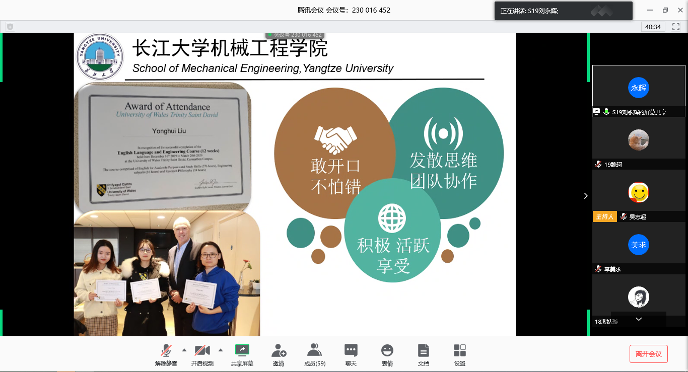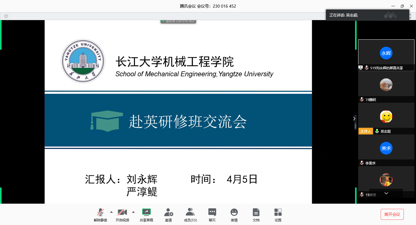 4月5日下午,太阳成集团122ccvip举行赴英研修班学子线上交流汇报会,硕士研究生刘永辉和严淳鳀与机械研二、研三员工分享英国三个月学习体会,交流探讨促成长。副经理李美求出席会议,活动由研究生员工会主席吴志超主持。