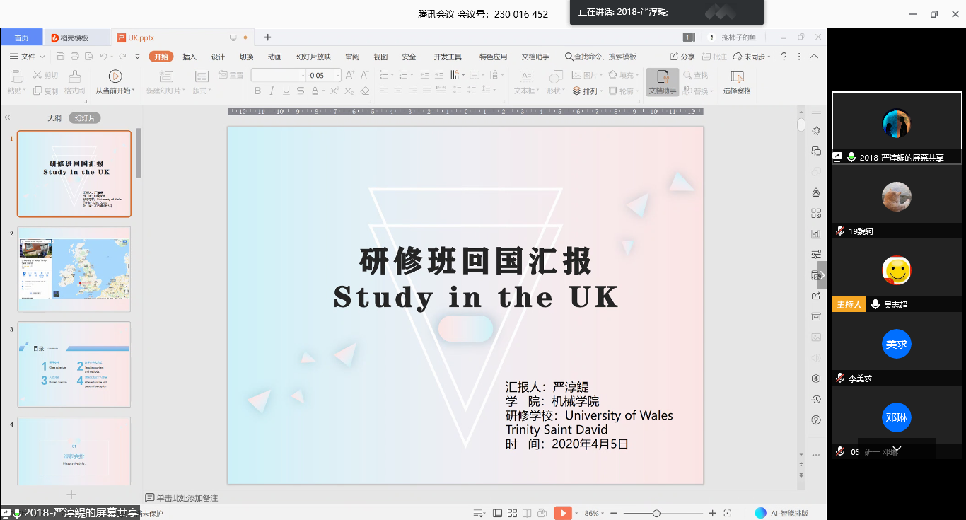 介绍完本次研修班的整体情况后,学习交流正式开始。2019级刘永辉同学重点分享她在英国学习英语的相关经验,认为注重语境学习勤张嘴非常重要,并建议同学们利用TED、BBC等加强自己的英语学习。同时,她通过展示英国的饮食、住宿和交通等生活情况,让大家共同领略世界文化的多样性。