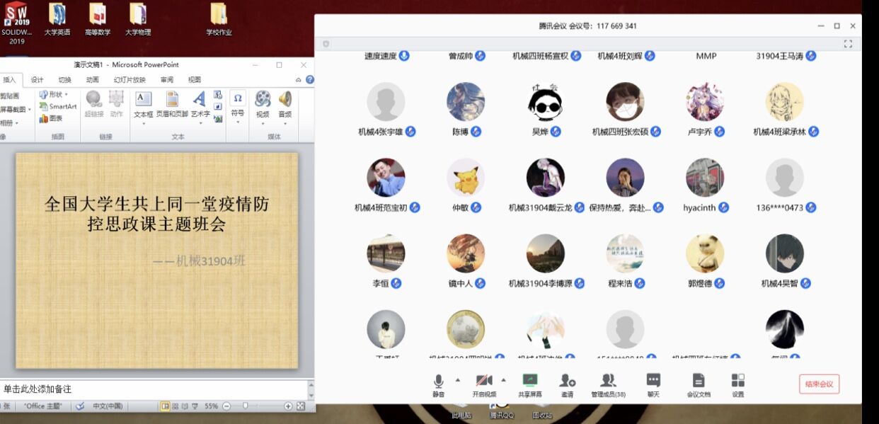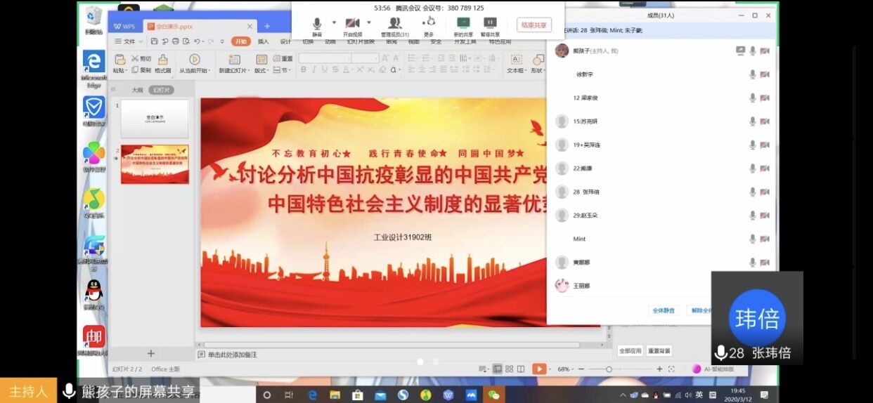 各班围绕此主题分别进行研讨学习。材料31902班周文静说:“通过这次慕课,我更加深刻的感受体会到奋战在前线的医护人员和社会各界人士的艰辛与不易。作为新时代青年,我会从自身做起,为疫情防控贡献自己的一份力量,要用过硬的专业本领迎接时代的考验。”