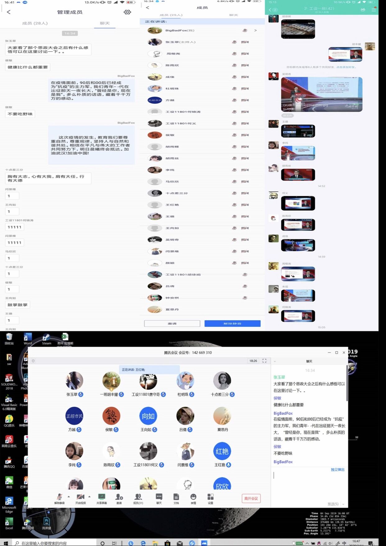 本次思政课由清华大学艾四林、中国人民大学秦宣、北京师范大学王炳林、中央财经大学冯秀军四位专家作线上报告。听完报告,大家纷纷表示在这次“保卫战”中,真切感受到中国抗疫彰显的中国共产党领导和中国特色社会主义制度的显著优势,14亿中国众志成城,创造了一系列的战“疫”中国速度、中国奇迹。中华民族历史上经历过很多磨难,不断在磨难中成长、从磨难中奋起。