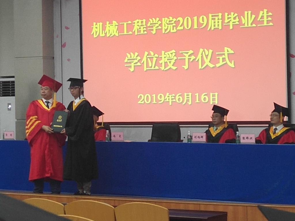 2019年6月16日下午,太阳成集团122ccvip在12教405会议室隆重举行2019届毕业生学位授予仪式。院学位委员会主席、经理冯定教授;院学术委员会主任马卫国教授;工业设计系主任刘旭辉教授;机电工程系主任华剑教授;材料工程系副主任张锦洲副教授作为毕业生导师代表出席学位授予仪式,仪式由魏磊磊同学主持。