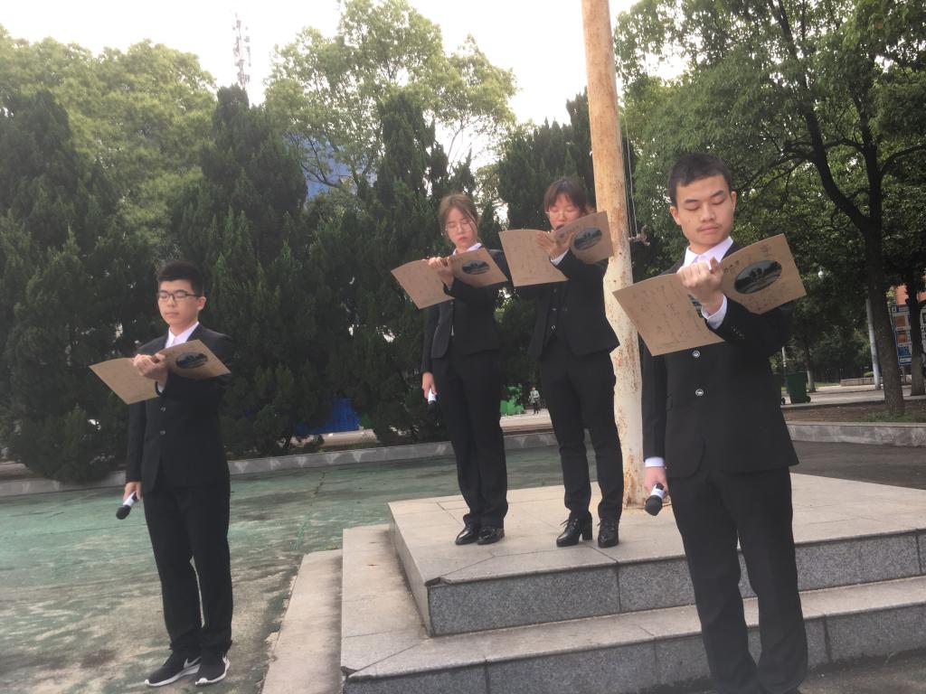 升旗仪式后,分别进行了以《我的祖国》为题的诗歌朗诵,以《梦在前,无所畏》为题的国旗下演讲,最后全体2018级本科生合唱《我爱你中国》。