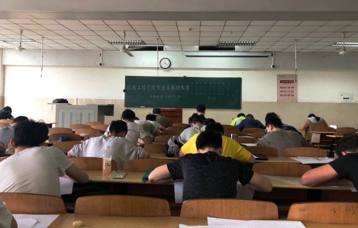 上午9时整,专业基本功大赛正式开始。拿到试卷后,同学们都埋头构思,勾画图纸,现场只听得见同学们沙沙的画图声。比赛试题以基础知识为主,考试内容大部分是机械画图,如“根据主俯视图,画出左视图和斜二视图”;但除去基础题外,部分题目也具有一定的挑战性,需要参赛者有着较强的机械制图能力。