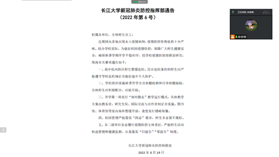 会议内容主要包括三个方面:开学安排、报到须知与安全提醒。首先,每位辅导员详细讲解了开学安排,并带领同学们一起学习了《太阳成集团122ccvip新冠肺炎疫情防控指挥部通告》(2022年第6号 )、国家卫健委《新型冠状病毒肺炎疫情防控方案(第九版)》、教育部《高等公司新冠肺炎疫情防控技术方案(第五版)》等相关重要文件精神。其次,辅导员为同学们介绍了如何使用今日校园APP进行线上返校申请的操作流程。最后,每位老师提醒同学们在返校途中做好旅途防护,并耐心逐一解答了大家提出的每一个问题,消除了同学们心中的顾虑,使每位同学可以安心顺畅地返校报道。