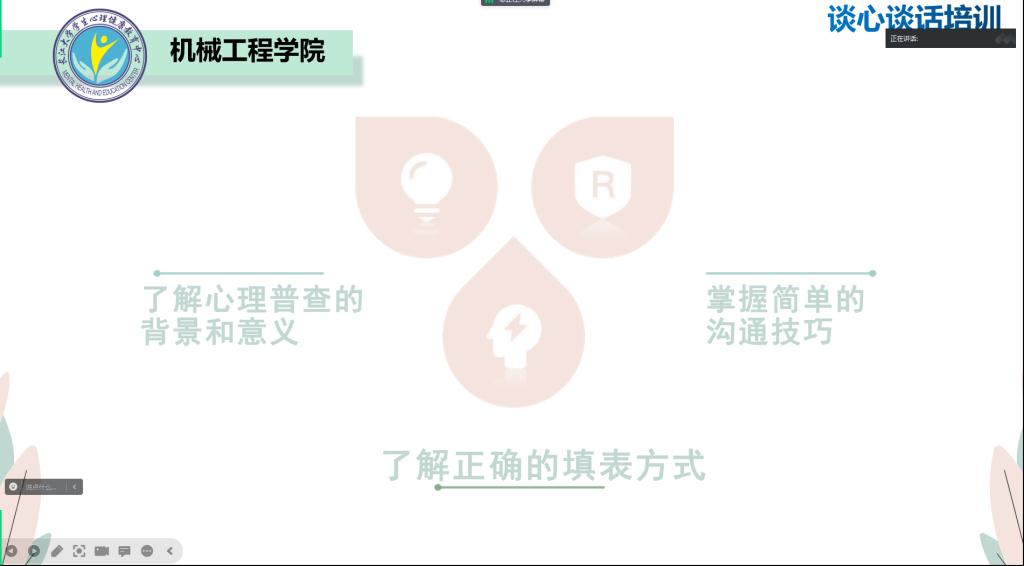 “ 18~24岁年龄组是心理问题高发的群体,大学时期的员工性格快速发展,是极易出现心理健康问题的一个阶段。”从背景引入,结合公司普查的实际工作情况,苏老师针对员工心理健康访谈工作进行详细的讲解。首先,能够区分员工的心理状态。其次,对员工的心理问题的预防和发现也提出了建议。再者以案例辅助,分享了与员工交谈中的经验与技巧。在集中学习《心理测评量表讲解》和《谈心谈话培训》两个视频文件后,老师们纷纷表示收益良多。