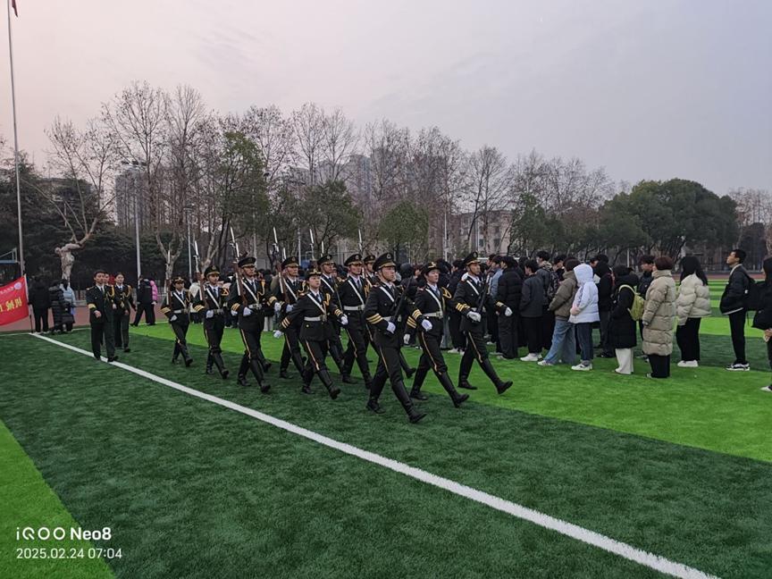 随着雄壮的国歌声响起,鲜艳的五星红旗冉冉升起,全体师生庄严肃立。会议由周中伟主持。仪式开始,国旗护卫队迈着整齐地步伐,护卫着国旗走向升旗台。随着国歌的奏响,五星红旗在微风中升起,迎风飘扬。